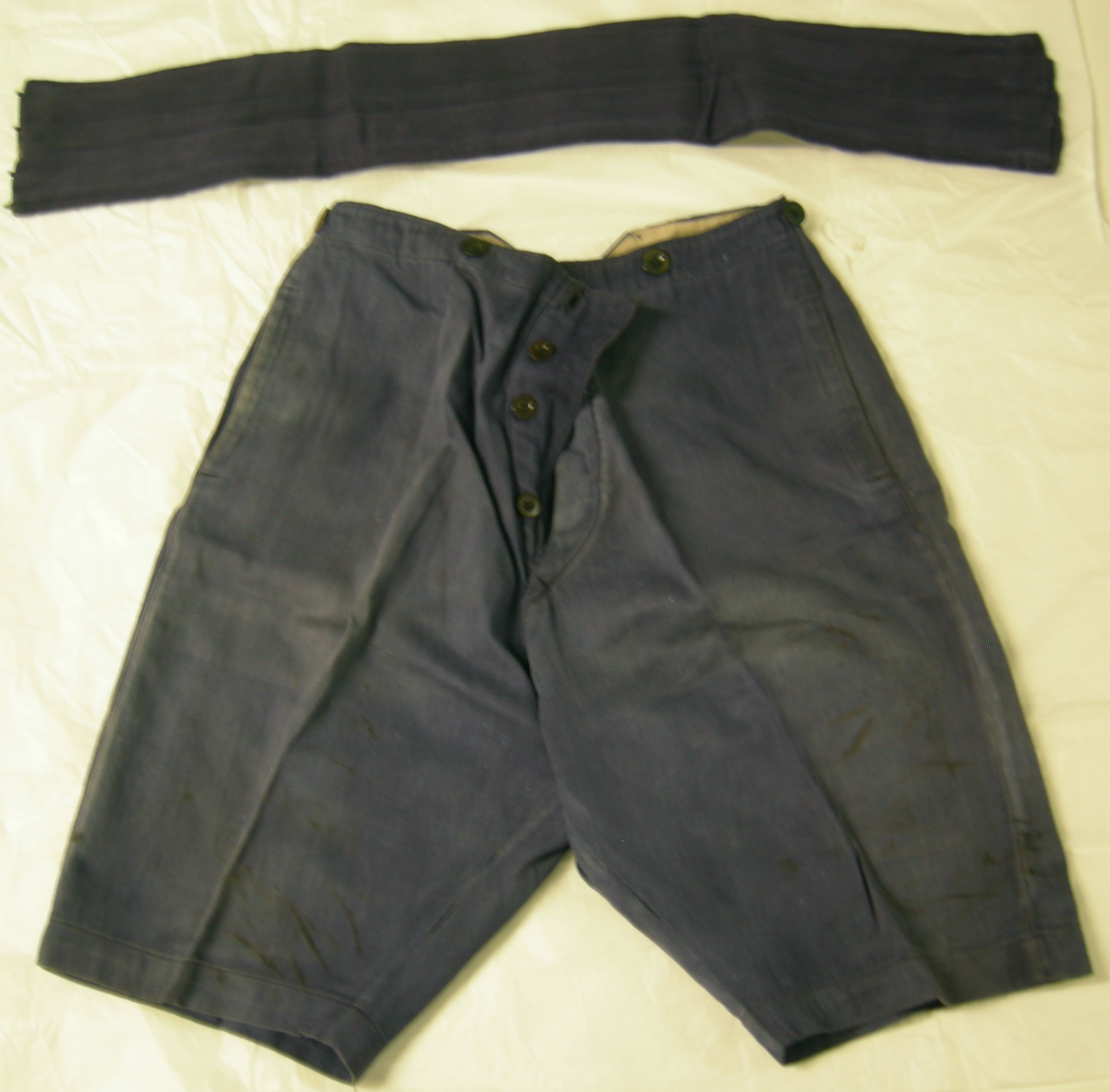 Korte jongensbroek van blauw keperkatoen. 6 zwarte knopen voor bretels. Gulp gesloten met 4 zwarte knopen. 2 zakken en binnenband van grijs katoen. Bij de broek en blauwe katoenen cumberband met 3 plooien, gevoerd met grijs katoen, gesloten met 4 haakjes en 4 trensjes.