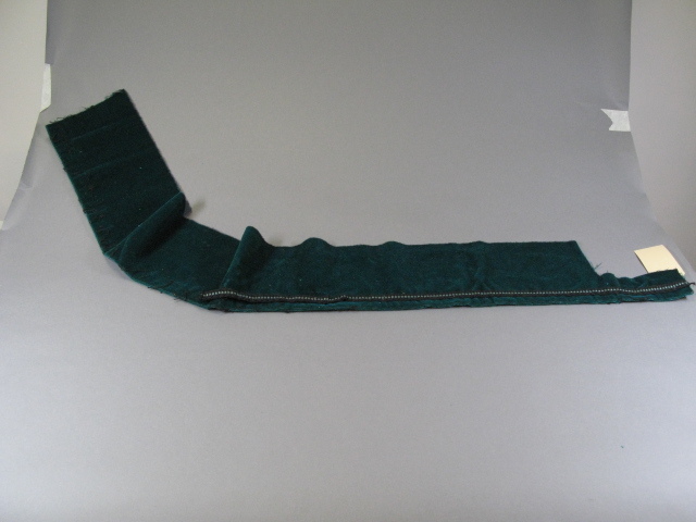 Lap donkergroen fluweel. Er zit een passement op, zwart met groene rechthoekjes. Het passement is van katoen en is een slangachtige vorm geknoopt.- Trefwoorden