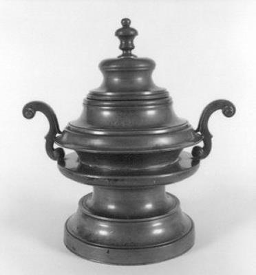 Op holle geprofileerde voet, ingesnoerde hals overgaaand in brede rand waarop de voluutvormige handgrepen van het deksel rusten- Trefwoorden