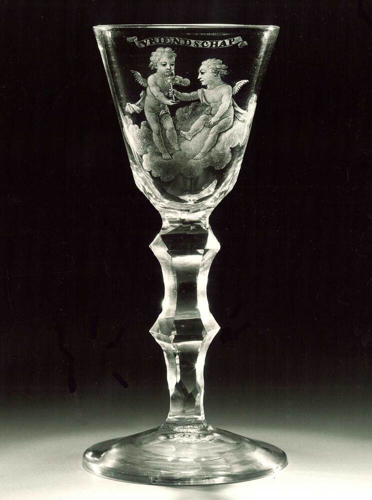 Helder kleurloos glas. Conische voet. Zeshoekige balusterstam met twee knopen. Conische kelk. Voet, stam en basis kelk in facetten geslepen. Op kelk twee putti op een wolk. Rechts een zittende putto, de ander een glas wijn aanreikend. Boven de voorstelling een tekstlint met het opschrift: VRIENDSCHAP.