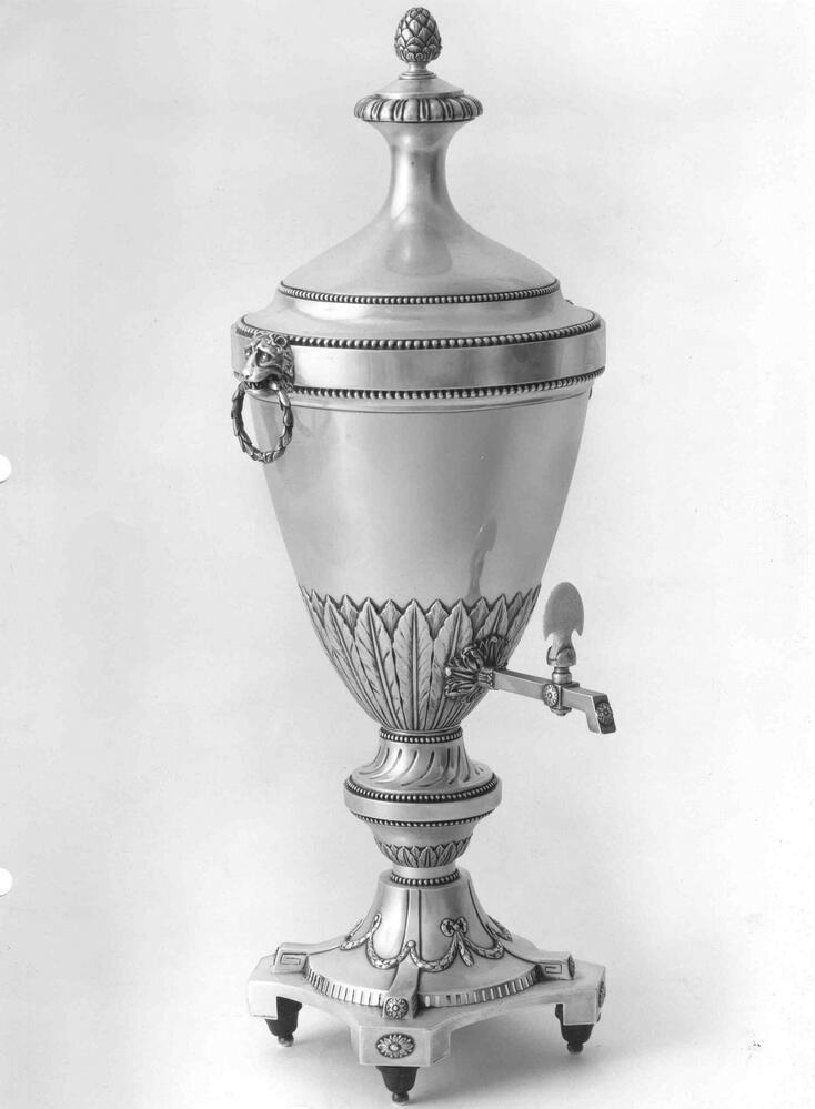 Theevaas met urnvormig lichaam en gewelfd deksel op los hoog voetstuk met komfoor. Gegoten en gedreven versieringen, deels geciseleerd. Vierkante voet met ingezwenkte zijden en afgeschuinde hoeken met rozetten op vier taps toelopende pootjes van coromandelhout en zilver. Voet met zich verjongend middendeel met verhoogde rand van ajourgezaagd traliewerk en vier hoekige ribben, de uiteinden met rozetten. Op de voet een guirlande van laurierbladeren, op vier plaatsen gestrikt. Boven de voet een tegengesteld gewelfde nodus met gladde band tussen parellijsten, de onderste helft met straalgewijs een dubbele rij laurierbladeren, de bovenste helft met getordeerde groeven. Glad lichaam, de basis met straalsgewijs een dubbele rij laurierbladeren. Bovenzijde lichaam met gladde band tussen parellijsten waarop twee geringde leeuwenmaskers, fungerend als grepen. Basis lichaam met rozet en vierkante, hoekig gebogen kraan met waaiervormige tap van ivoor. Rozetten op voorzijde en zijkanten kraan. Zich verjongend deksel met parellijst, uitlopend in uitstaande kraag met alternerend gladde en gegroefde godrons. Dekselknop in de vorm van een dennenappel op geprofileerd voetstuk.