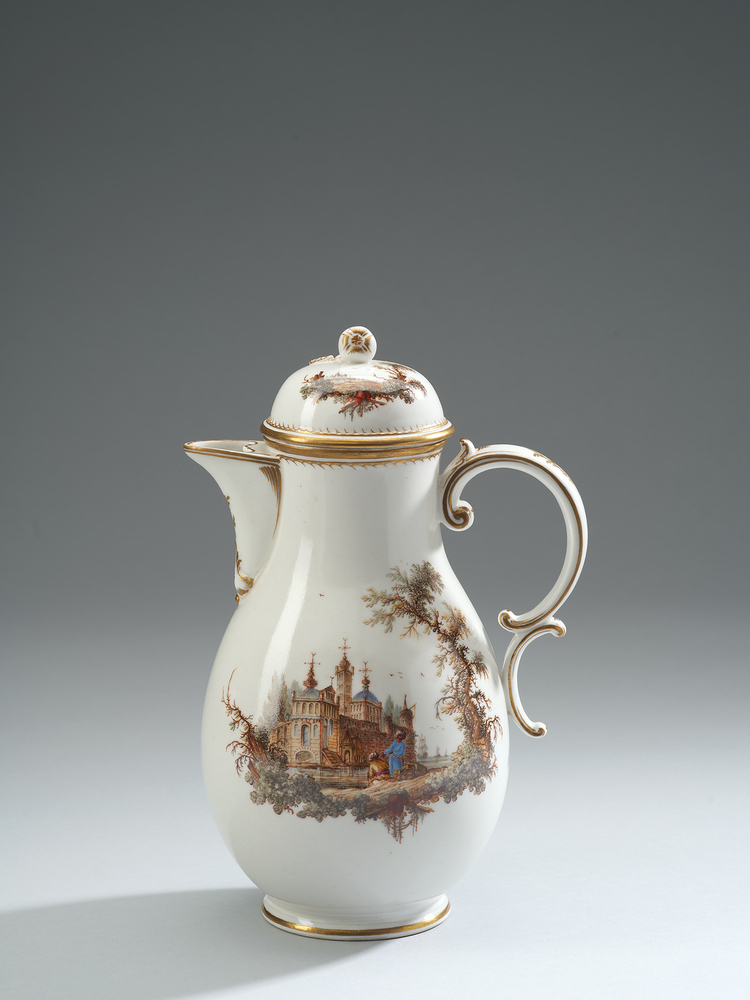 Koffiekan veelkleurig beschilderd met waterlandschappen in groen en bruin met Oosterse figuren in blauw, roodbruin en paars aan de oever en met grote Oosterse fantastie-paleizen aan de overkant met lichtblauwe ramen en daken. Op het deksel kleinere waterlandschappen en een deels vergulde vrucht aan takje met blaadjes als knop. Gouden biezen langs de randen, ook oren en tuit zijn versierd in goud. Merk: M:OL= (onderglazuur blauw)
