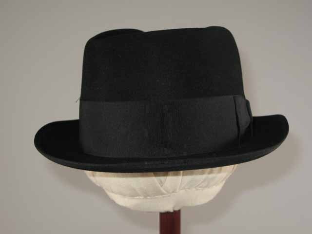 Zwarte vilten hoed met rond de bol een zwart zijden ripslint van 5 cm. In de bol, op een lapje gele zijde, het merk "Borsalino".