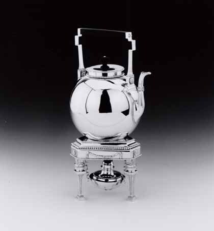 Bouilloire met deksel op komfoor met brander. Driehoekig komfoor met afgeschuinde hoeken op drie pootjes. Poten met vierkante basis en parellijst, waarop vierkante zich verwijdende zuil met op de vier zijden een patroon van halve cirkels. Hierboven ronde kraag met bloemen en vierkant bovenstuk met cannelures. Lange zijden komfoor met afhangende krans van laurierbladeren, de korte zijden met rozetten. Bovendeel komfoor concaaf gewelfd met ronde uitsparing, als steun voor de ketel dienend. Parellijsten op onder-, midden- en bovendeel komfoor. Ronde halfbolle brander met cannelures, de onderzijde met een rozet. Bovenzijde concaaf gewelfd met parellijst en halfbolle dop met knop in de vorm van dennenappel. Brander met drie schakelkettingen aan komfoor hangend. Ketel met bolvormig lichaam op standring. S-vormige tuit met cannelures en vierkante kraag, de zijden met een rozet. Parellijst rond schenktuit en aanzet. Hoekig gebogen hengsel met cannelures en rozet en ebbenhouten greep. Aanzet hengsel met een gegoten rozet en parellijst. Plat deksel met ronde ebbenhouten knop. Parellijst rond deksel en hals ketel.