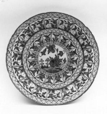 rond bord. In het midden rond medaillon met landschap en bloemen, daaromheen, straalsgewijs bloemranden- Keywords