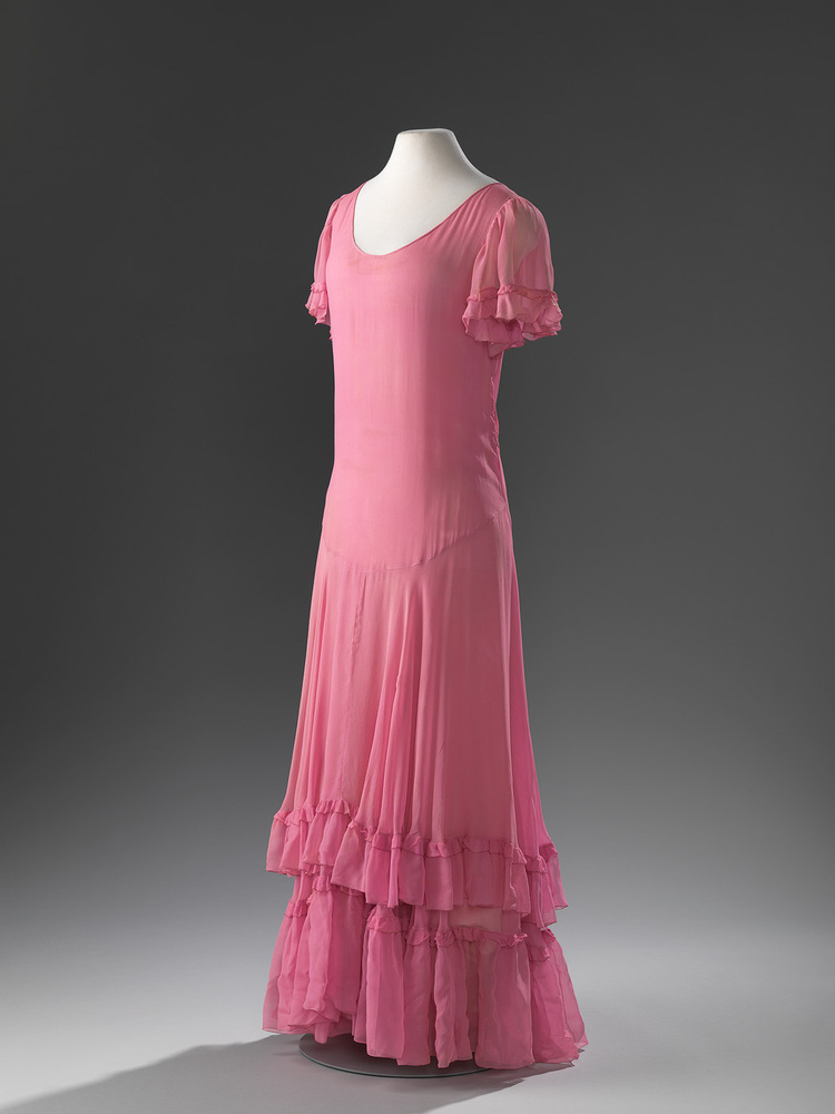 Roze avondjurk. Korte, waaierachtige mouwen, afgezet met een schuin geknipte, aangerimpelde rok. Ronde hals, verlaagde taille. Dubbele rok afgezet met brede, gerimpelde stroken; in de zijnaad op de taillehoogte lange ceintuurbanden, welke op de rug tot een strik geknoopt kunnen worden.