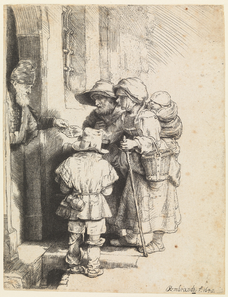 - Bedelende familie ontvangt een aalmoes aan de deur van een huis, 1648