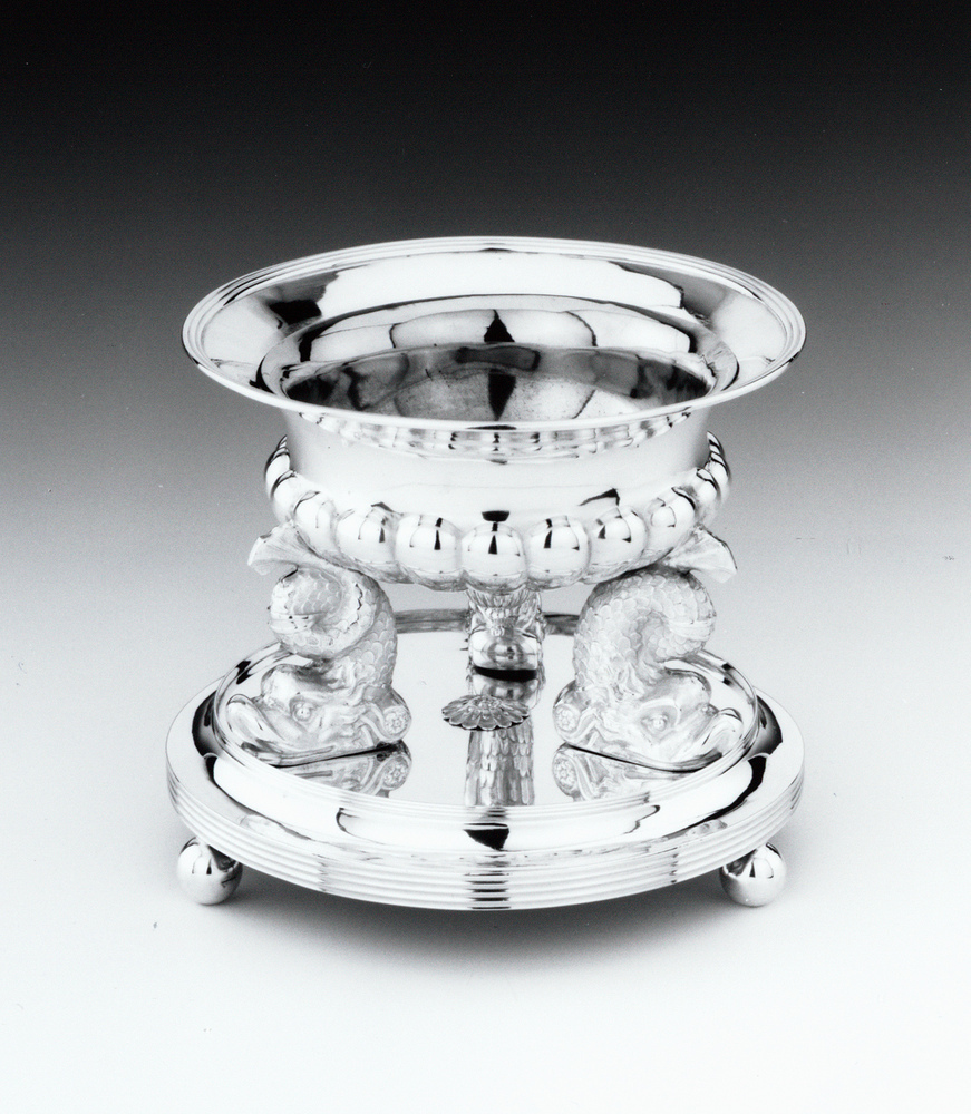 Dergelijke zware vormen zijn kenmerkend voor veel van het zilverwerk uit de Biedermeierperiode. Stilistisch verwant zijn een paar kastanjevazen uit 1830 door de Fa. Bennewitz & Zonen (cat.nr. KA 19357) en een olie- en azijnstel van de Wed. J.H. Stellingwerff & Van Grasstek uit 1831 (cat.nr. KA 18144). Zie voor een pijpenkomfoor op een zilveren blaadje, in 1806 door Diederik Lodewijk Bennewitz en Jacob Hendrik Stellingwerff vervaardigd: cat.nr. KA 18030. ( Bert Vreeken)