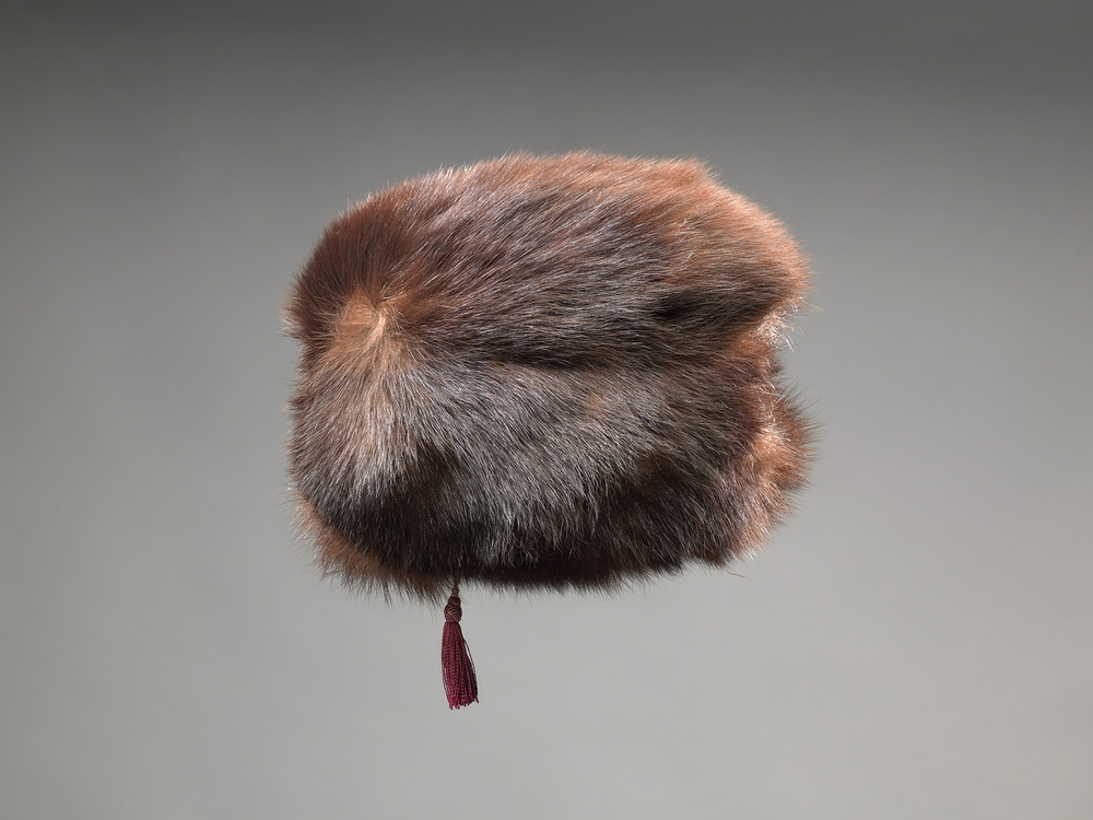 Mof van bont gevoerd met bruine zijde; zakje met ritssluiting; kwastje van donkerrood zijdegaren.