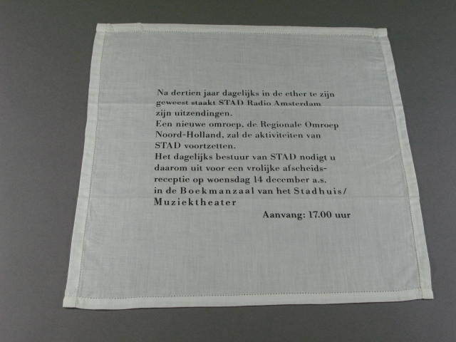 Een grote zakdoek van Radio STAD, al dan niet bedoeld om ook traantjes mee te kunnen deppen. Hierop staat de uitnodiging voor ‘een vrolijke afscheidsreceptie’ vanwege het stoppen van de locale zender eind 1988. Het beleid van de overheid was er toen op gericht dat provincies (of enkele provincies samen) een eigen omroep moesten kunnen krijgen. De provincie Noord-Holland besliste dat er ook een Radio Noord-Holland moest komen. Op 1 januari 1989 ging deze van start. Het merendeel van de medewerkers van Radio STAD maakte niet de overstap naar die nieuwe omroep. Radio STAD heeft 13 jaar bestaan; de eerste uitzending vond plaats precies 35 jaar geleden, op 5 januari 1976. ( Frans Oehlen)