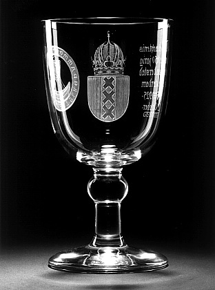 Helder kleurloos glas. Platte verdikte voet. Stam met knoop. Cilindrische kelk met afgeronde basis. Op kelk het gekroonde stadswapen van Amsterdam, het zegel van met het Koggeschip en het opschrift: .S:OPIDI.DE.AMSTELREDAMME/ (Zegel der burgers van Amstelredamme). Op andere zijde in gotische letters het opschrift: Ter gedachtenis/ aan het 650 jarig/ bestaan der stad/ Amsterdam/ 1275 - 1925./ 27 October./. Gepolijste details.