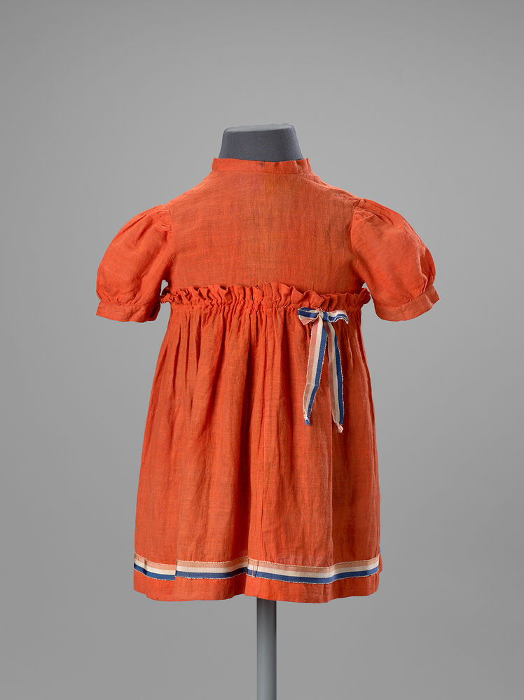 Kinderjurk van dunne oranje katoen. Lijfje met pofmouwen. Aangerimpelde rok. Langs de zoom is een ripslint gestikt in de kleuren rood, wit en blauw. Links achter in de taille een strik van ditzelfde ripslint.