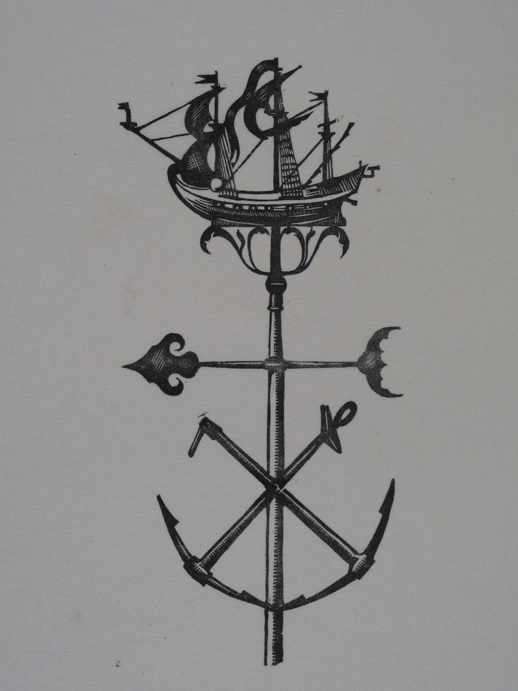 - Houtsnede van de Windwijzer, afkomstig uit het voormalig admiraliteitsgebouw, thans stadshuis "'t Koggeschip", 1935