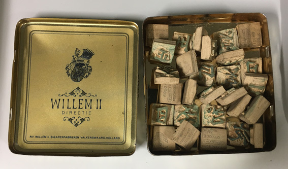 - Chinese boedel, Willem II sigarendoosje met 28 rubberen stempelblokjes met Chinese karakters, 1950 - 1990