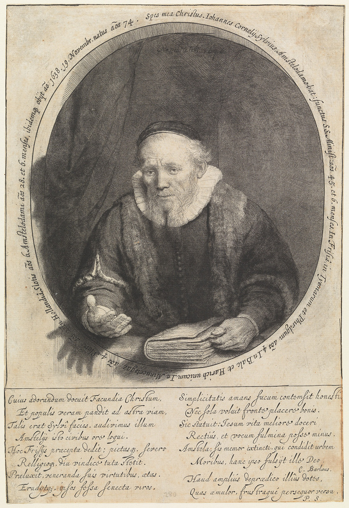 opschrift in plaat: atijnse tekst, rond ovaal en 2-delig latijns gedicht van C. Barleus