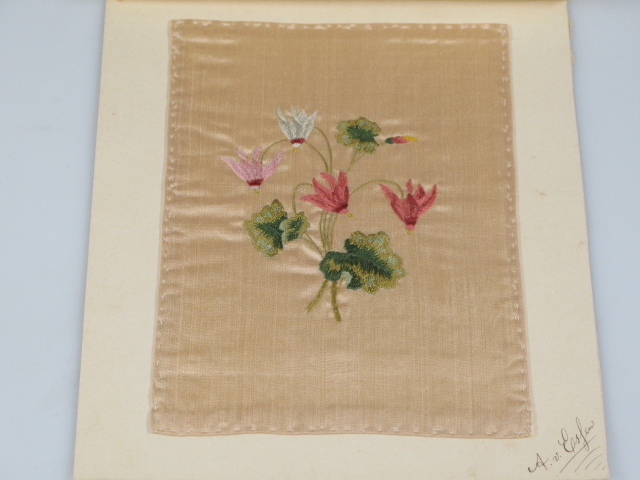 Lapje shantung, naturelkleurig middenveld cyclamen met bladen in satijnsteek; donkergroen, lichtgroen, donkerrose, lichtblauw en geel.- Trefwoorden