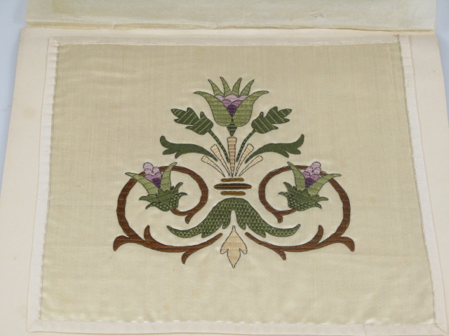 van zware naturelkleurige satijn, gezet op een dunne katoenen onderlaag.