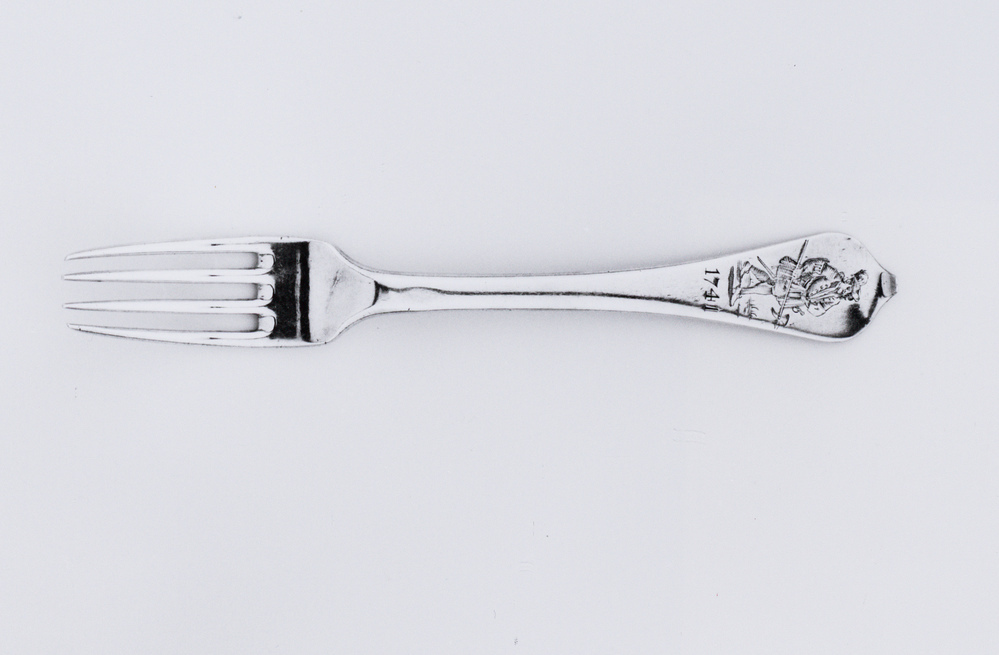 Vork, steel met accoladevormige kop. Op bovenzijde steel is een voorstelling gegraveerd van een schuttersfiguur, staand op een voetstuk, waaronder het jaartal: 1741/. Op onderzijde steel zijn de initialen: J.T./ D.V./ gegraveerd.