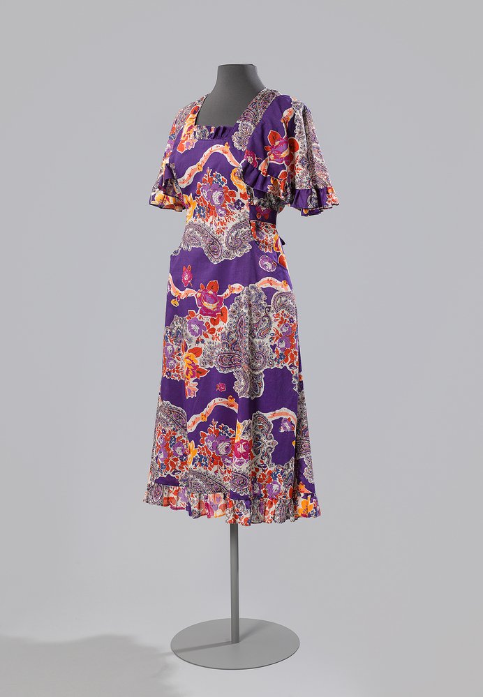 Gebloemde zomerjurk in de kleuren paars, oranje, roze, bruin, blauw, geel en naturel. Voorkant van de jurk heeft geen taillenaad, de rok loopt gerend uit. Halfronde insteekzakken, waarvan de naad doorloopt als siernaad over de buste naar het midden van de schouder. Op taillehoogte is in de coupenaad aan weerszijden een band gestikt, welke achter in een strik sluit. U-vormige uitgesneden hals, ingezette, halve cirkel langs armsgat, waardoor het idee van een losvallende mouw ontstaat. De onderkant van de halve cirkel, de onderkant van de hals en zoom zijn voorzien van een aangerimpelde strook van dezelfde stof. De jurk sluit middenachter door een rits van zestig centimeter. De gehele jurk is gevoerd met hardpaarse voeringzijde.