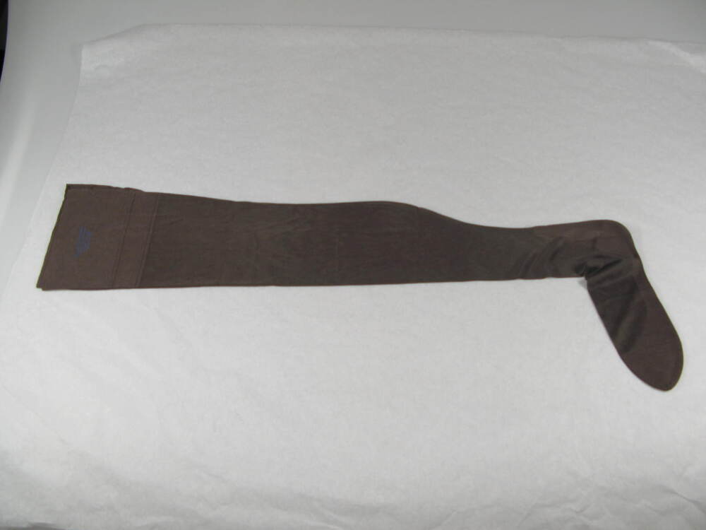 Paar dameskousen met naad van taupe kleurige nylon. Opschrift in boord: 45 Gauge full fashioned knit of Dupont Nylon Cotton top/foot irregulars.- Trefwoorden