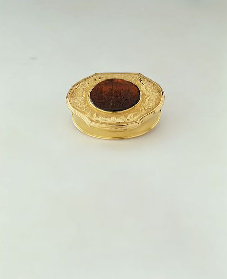 Snuifdozen waren een belangrijk kledingaccessoire in het 18e-eeuwse Europa en verfijnde eigenaars hadden dozen naar de laatste mode. Een complexe etiquette omringde het nemen van snuiftabak, een preparaat van tabak om door de neusgaten te inhaleren. Ovale doos met ingesnoerde wand en cartouchevormig, scharnierend deksel met rechte achterzijde en duimstuk. Profielrand langs onderzijde doos en deksel. Het deksel is gemonteerd met een gegoten camee van roodbruine glaspasta, voorstellende keizer Marcus Aurelius, generaal Claudius Pompejanus en een gewonde barbaar, de keizer om genade smekend temidden van een groep soldaten. Op rand deksel een gedreven voorstelling van een vogel, een konijn en een hond, binnen een omranding van C- en S-voluten, rocailles en bloemen op een geruwde ondergrond.