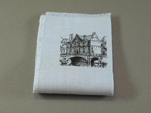 6 placemats en 6 bijbehorende vingerdoekjes; half linnen; hemelsblauw; de kanten zijn afgewerkt d.m.v. een flanelsteek; de laatset 3/4 cm. zijn uitgerafeld. Linksboven, in zeefdruk uitgevoerd, met zwarte inkt, een stadsgezicht; hetzelfde stadsgezicht staat ook op het vingerdoekje.- Trefwoorden
