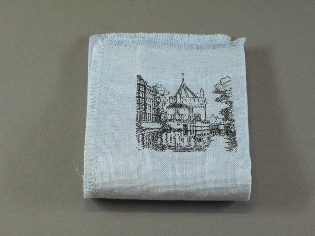 6 placemats en 6 bijbehorende vingerdoekjes; half linnen; hemelsblauw; de kanten zijn afgewerkt d.m.v. een flanelsteek; de laatset 3/4 cm. zijn uitgerafeld. Linksboven, in zeefdruk uitgevoerd, met zwarte inkt, een stadsgezicht; hetzelfde stadsgezicht staat ook op het vingerdoekje.- Trefwoorden