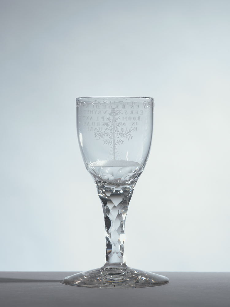 Het glas memoreert de revolutiedagen van 1795 in Amsterdam. Op 19 januari van dat jaar werd het Franse 'bevrijdingsleger' met gejuich binnengehaald. Men hakte in de Watergraafsmeer een dennenboom om en plantte deze als Vrijheidsboom op de Dam. Omdat de boom door de strenge vorst niet in de grond kon worden verankerd, gebeurde dit met behulp van touwen en gewichten (Vreeken 1995, p. 152). Een glas met identieke voorstelling en opschriften, maar met een afwijkend geslepen stam, bevindt zich in The Corning Museum of Glass, Corning NY, VS (Bequest Jerome Strauss, inv. nr 79.3.429). ( Bert Vreeken)