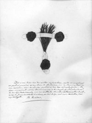 opschrift onder dennetakje: Dit is een takje van den eersten vryheidsboom, welke is aangebragt / en geplant geworden, op den Dam, te Amsterdam, den 19 Ianuary, 1795, en / ondergeteekende. De / boom was gehaald uit den Diemermeer van de Buitenplaats: Frankendaal, / te dier tijd toebehoorende aan den weledelen heer Jan Gildemeester Jansz., / en zijn de samenhechtsels, hierboven, om het takje, met myne cachetten, door / my verzegeld. / B. Rekker