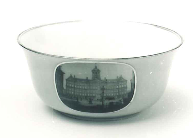 Ronde kom met licht gewelfde rand, op standring. Aan een zijde van de wand een afbeelding van het Koninklijk Paleis op de Dam, aan de andere kant een afbeelding van het Paleis voor Volksvlijt op het Frederiksplein. Op de onderzijde in bovenglazuur, in zwart, de opschriften: Kon.Paleis, en: Paleis voor Volksvlyt.