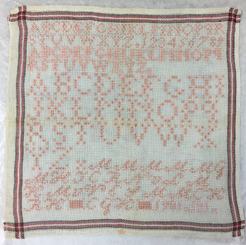 Cornelia laat behalve een paar stoplappen en een borduurlap, ook twee letterdoeken na. Een grijsblauwe uit 1900 en deze oudroze uit 1901. Deze laatste lap is voornamelijk gevuld met twee alfabetten in kruissteek en één grotere versie uitgevoerd in stersteek. Wat er nog rest van de 30 bij 30 cm metende doek, wordt gevuld met de initialen van onder andere de regentessen van weeshuis, die moeder genoemd werden: Moeder Momma, Moeder Matthes en Moeder Groenewegen. De naam van de vierde moeder blijft onbekend. Op de onderste regel heeft ze haar ouders -RK en GCK- het jaar waarin de doek voltooid is -1901- en haar weeshuisnummer -181- achtergelaten, gescheiden door twee naaikussentjes. Deze kussentjes werden op schoot gelegd om het handwerk te ondersteunen. De meisjes brachten vele uren door met handwerken. Het is dan ook niet verwonderlijk dat hier één van de belangrijkste handwerkattributen een plaats heeft gekregen. De kwastjes op alle vier de hoeken wijzen erop dat het om een kussentje gaat. Cornelia gebruikte katoenen garen op een katoenen stramien.