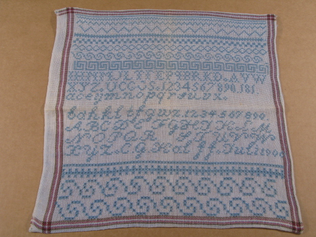 Niets is minder waar. Het is opgebouwd naar moeilijkheidsgraad. Eerst leren de meisjes de stokletters borduren de I H N M J L F E P B R K en D. Als ze dat onder de knie hebben komt de volgende uitdaging, de zogenaamde schuine letters A V W X Y en Z en ten slotte de ronde U C G O Q en S. Zonder het ‘geboortejaar’ van beide doeken te kennen, wijst dit IHN-alfabet erop dat deze doek eerder tot stand kwam dan de oudroze letterdoek. Het tweede alfabet lijkt in willekeurige volgorde uitgewerkt te zijn in onderkast, eveneens afgesloten door een cijferreeks. Dan volgt een derde, ABC-alfabet in kapitalen, cursief. Op de laatste regel borduurt Cornelia haar naam C.G.KALFF en het jaar 1900, het jaar waarin de doek voltooid is. Het onder- en bovenregister zijn gevuld met sierranden van allerlei aard. Ze heeft wollen garen gebruikt op een katoenen stramien, met ingeweven rode rand van 31,5 x 31,5 cm. De doek is daarmee verwant aan een rodeschoollap.