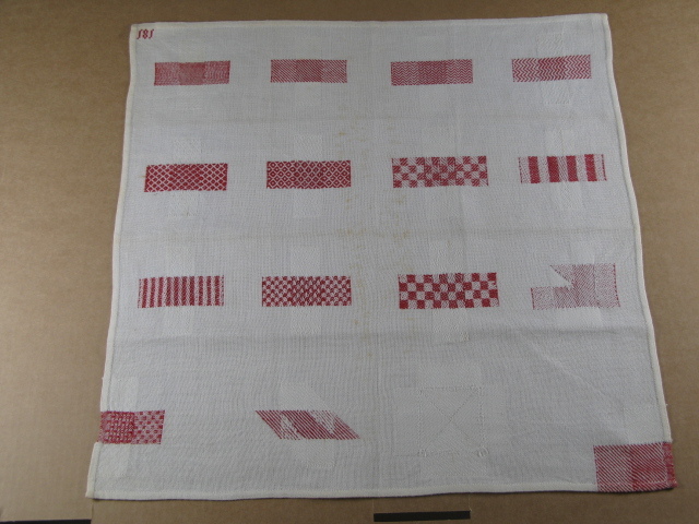 Deze stoplap van Neeltje, één uit vier, is onderverdeeld in zestien denkbeeldige vakken, waarin tal van stoppen op regelmatige afstand van elkaar in rood garen uitgewerkt zijn. Stoppen in linnenbinding, in keperbinding, keper- en satijnbinding en in satijnbinding vullen de eerste tien vakken. Dan passeren de stoppen met een hogere moeilijkheidsgraad de revue: een winkelhaak-, een randstop en de hoekstop. De op één na laatste, de inzetstop, is uitgevoerd met garen in dezelfde kleur als de ondergrond. Een ware uitdaging. Er werd bij voorkeur met gekleurd garen gewerkt, zodat de nog jonge en onervaren borduursters beter zicht hadden op de patronen, die onder hun handen tot stand kwamen. Eventuele fouten sprongen daardoor wel sneller in het oog van meestal strenge handwerkjuffrouwen en linnenmatressen. Neel heeft de test echter met vlag en wimpel doorstaan. In de linkerbovenhoek ‘signeert’ ze haar doek met haar weeshuisnummer, 181; waarschijnlijk niet zonder gepaste trots.