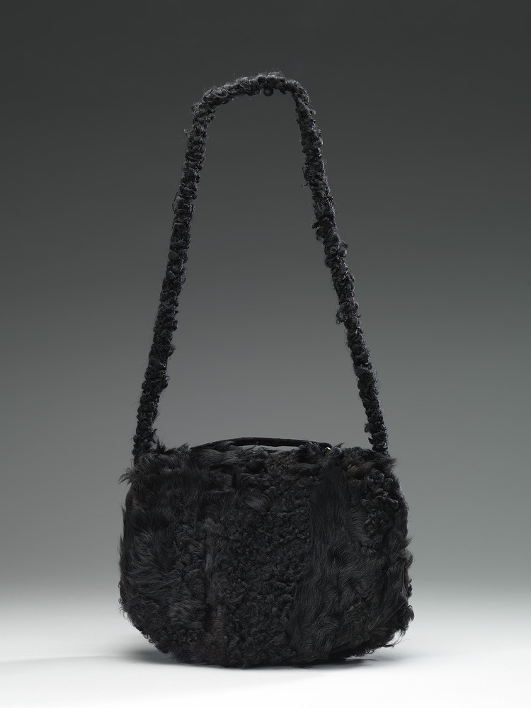 Tas van zwarte astrakan met zwart wollen hengsel. De sluiting is met een drukknop langs de onderzijde. In de voering bevinden zich twee aparte vakken, waarvan één met een spiegel.