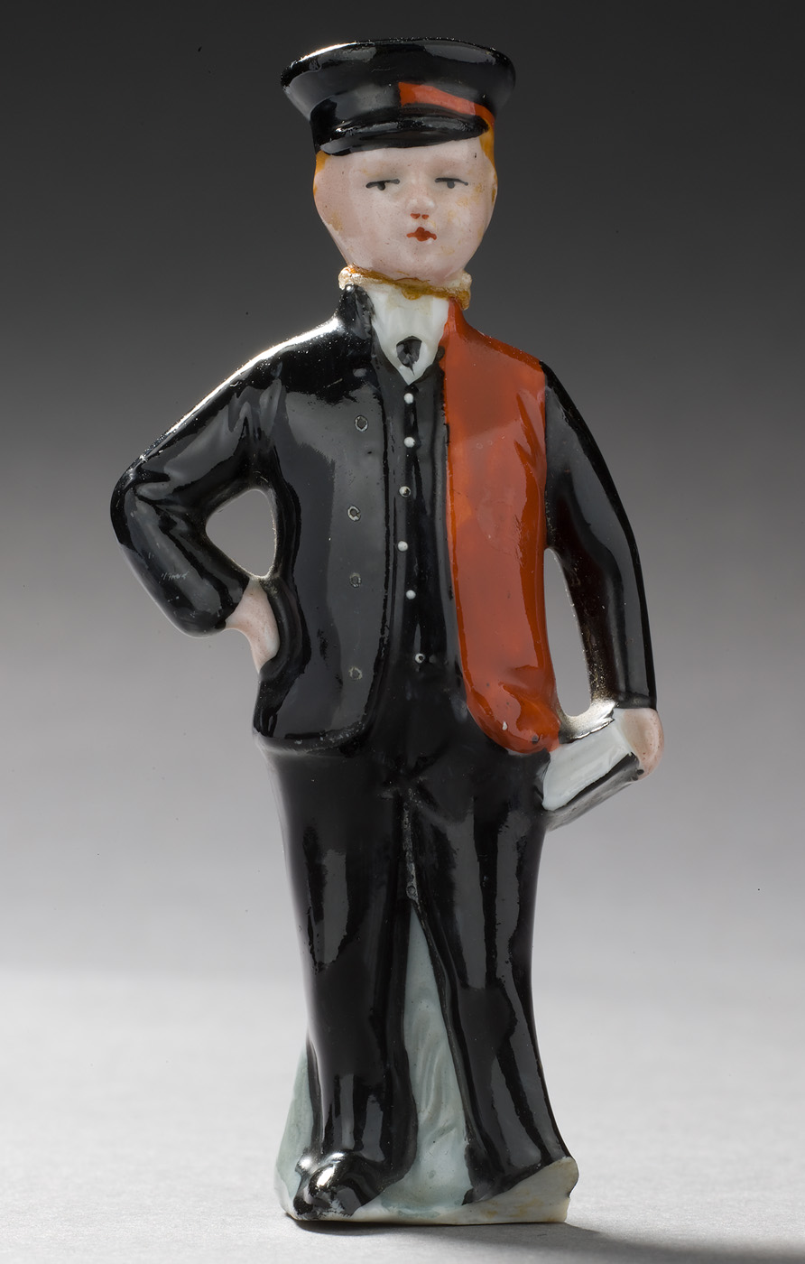 In het Amsterdamse Burgerweeshuis konden kinderen van Amsterdamse poorters (burgers met rechten om in de stad te wonen) terecht, die geen ouders of een moeilijke thuissituatie hadden. De Burgerwezen waren traditioneel gekleed in een zwart-rood uniform, dat voor jongens onder meer uit een broek, tweekleurig vest en pet en voor meisjes uit een kapje, tweekleurige jurk en witte onderkleding bestond. Het wezenuniform had een tweeledig doel: niet alleen zagen alle kinderen er ongeacht hun achtergrond allemaal hetzelfde uit, ook waren de Burgerwezen zo op straat gemakkelijk te herkennen. Weglopers konden zo eenvoudig gespot worden. In 1919 kwam er een einde aan het verplichte uniform, maar porseleinen beeldjes zoals deze hielden het in herinnering. ( Sarah Remmerts de Vries)