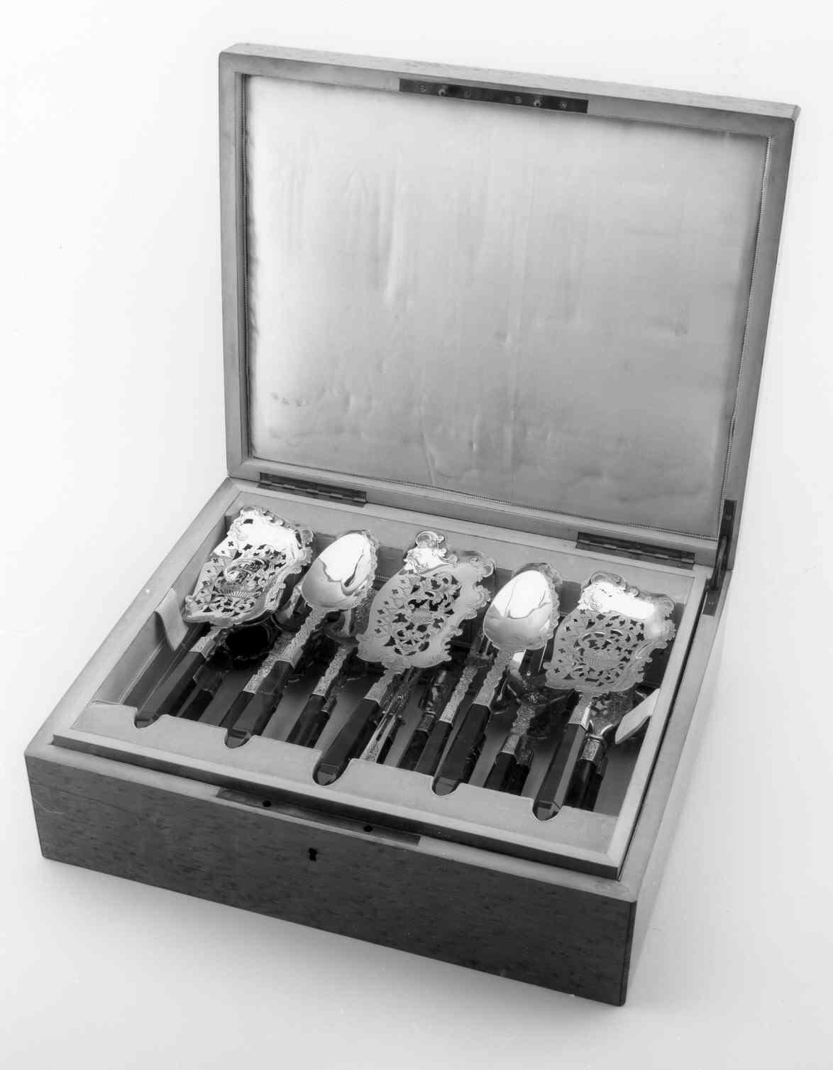Met de welstand van de negentiende-eeuwse burgerij nam de behoefte aan comfort toe. Dit leidde onder meer tot een aanzienlijke uitbreiding van het assortiment tafelgerei. Deze kist met zijn kostbare inhoud illustreert die ontwikkeling op treffende wijze. De meeste onderdelen zijn bestemd voor het opdienen van verschillende soorten desserts. Het is echter niet onmogelijk dat de botervorkjes tevens gebruikt zijn als vleesvorkjes en dat met het saladecouvert ook wel fruit is opgediend. Daarnaast zouden het taartmes en de taartvork hebben kunnen dienen voor het serveren van meloen of vis.