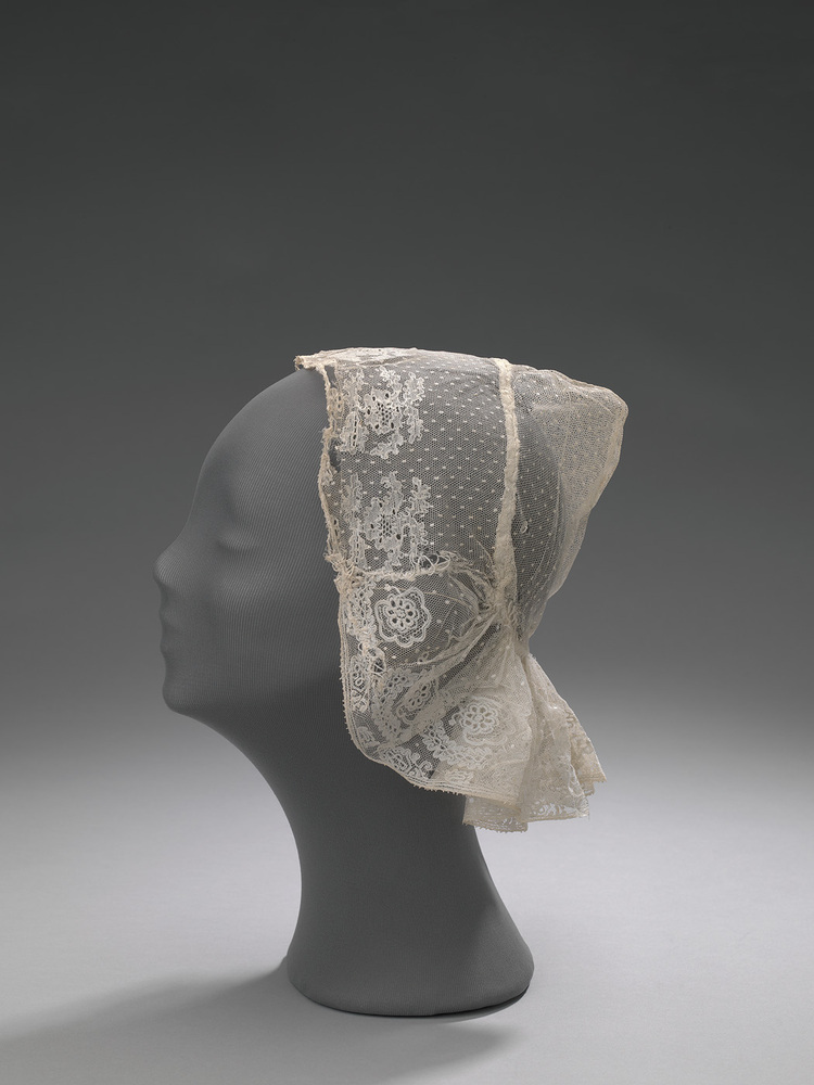 Witte muts van ingeweven stippen tule, met machinale kanten rand. Beroepskleding, geen mode. Onduidelijk te dateren, moet nader onderzocht.