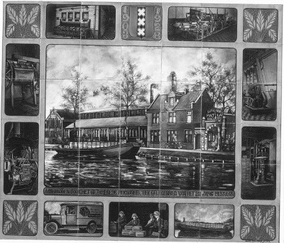 Een tegeltableau is een vlak, bestaande uit meerdere aardewerken tegels, die door een schildering één voorstelling vormen. Tegeltableaus werden vanaf de zeventiende eeuw populair, omdat ze zowel decoratief als functioneel waren. Ze boden uitkomst tegen vocht, waar huisjes langs grachten en kanalen nogal eens last van hadden, en waren gemakkelijk schoon te houden. Daarnaast zorgden de uit Italië afkomstige vormen, kleuren en motieven voor een vrolijke aanblik rond de haard of in de gang. In de periode van de Jugendstil (ca. 1900) leefde de aandacht voor tegeltableaus opnieuw op. Families en bedrijven die het zich konden veroorloven, lieten wanden, gevels en portieken versieren met tegeltableaus in Art Nouveau stijl. Ook voor jubilea en andere feestelijke gelegenheden werden soms tegeltableaus vervaardigd. Dit tegeltableau is door N.V. Plateelbakkerij Zuid Holland (P.Z.H.) vervaardigd en verbeeldt verschillende scènes in Biscuitfabriek 'Patria'. ( Sarah Remmerts de Vries)