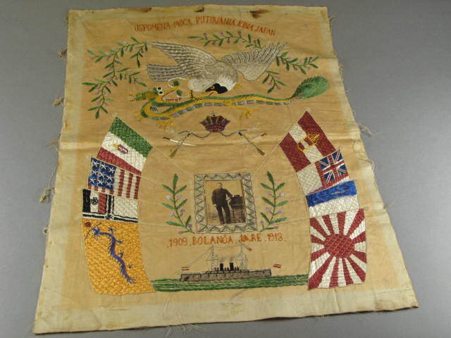 Boven foto staat een geborduurde kroon met aan weerszijden gevechtswapens. Daarboven een adelaar die een draak aanvalt. Het doek heeft aan bovenzijde de volgende tekst: USPOMENA MOCA PUTOVAHIA KINA JAPAN (=Servo-Kroatisch voor: "Herinnering aan mijn reis naar China en Japan).