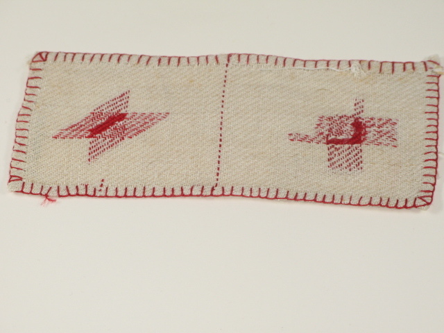 Piepklein is het werkje waarin Magteltje twee stoppen heeft verwerkt. Er zijn twee opties. Mogelijk is het een proeflapje, een voorbereiding op het grotere werk. Deze doeken worden veelal met rijgsteekjes onderverdeeld in vakken waarbinnen een stop is uitgewerkt. Mevrouw Berthi Smith-Sanders echter vermoedt dat het een omslag van een naaldenboekje is. Met de rode stippellijn is de rug van het boekje afgetekend. De stukjes stof waar de naalden in gestoken kunnen worden ontbreken. Het is klein van formaat, 16 x 7 cm. Magteltje koos voor rood zijden garen op een linnenondergrond. Het omzomen van het doekje, met een festonsteek, doet vermoeden dat het een praktische functie heeft gehad en in het gebruik niet mocht rafelen. Misschien is haar naaldenboekje ook een proeflapje of werd haar proeflapje een naaldenboekje? Magteltje voltooide dit werkje rond 1920.