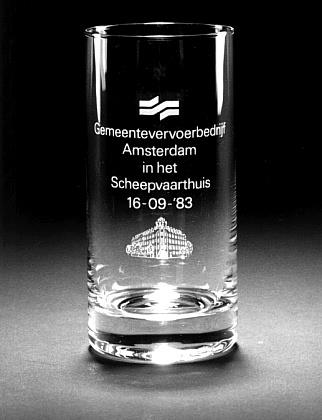 Helder kleurloos glas. Vlakke verdikte bodem. Cilindrisch lichaam. Op lichaam in mat-witte opdruk het opschrift: Gemeentevervoerbedrijf/ Amsterdam/ in het/ Scheepvaarthuis/ 16-09-'83/. Hierboven het beeldmerk van het Gemeentevervoerbedrijf; eronder een afbeelding van het Scheepvaarthuis.