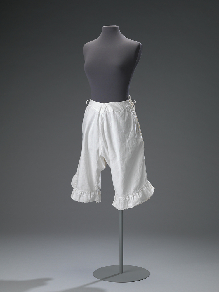Onderbroek van wit katoen. Zijsplitten in de taille, sluitend met striklinten. Het achterpand is gerimpeld aan de tailleband gezet. De tailleband van het voorpand heeft een V-vorm. De pijpen zijn onderaan versierd met een aangerimpelde strook katoen met geschulpte zoom.