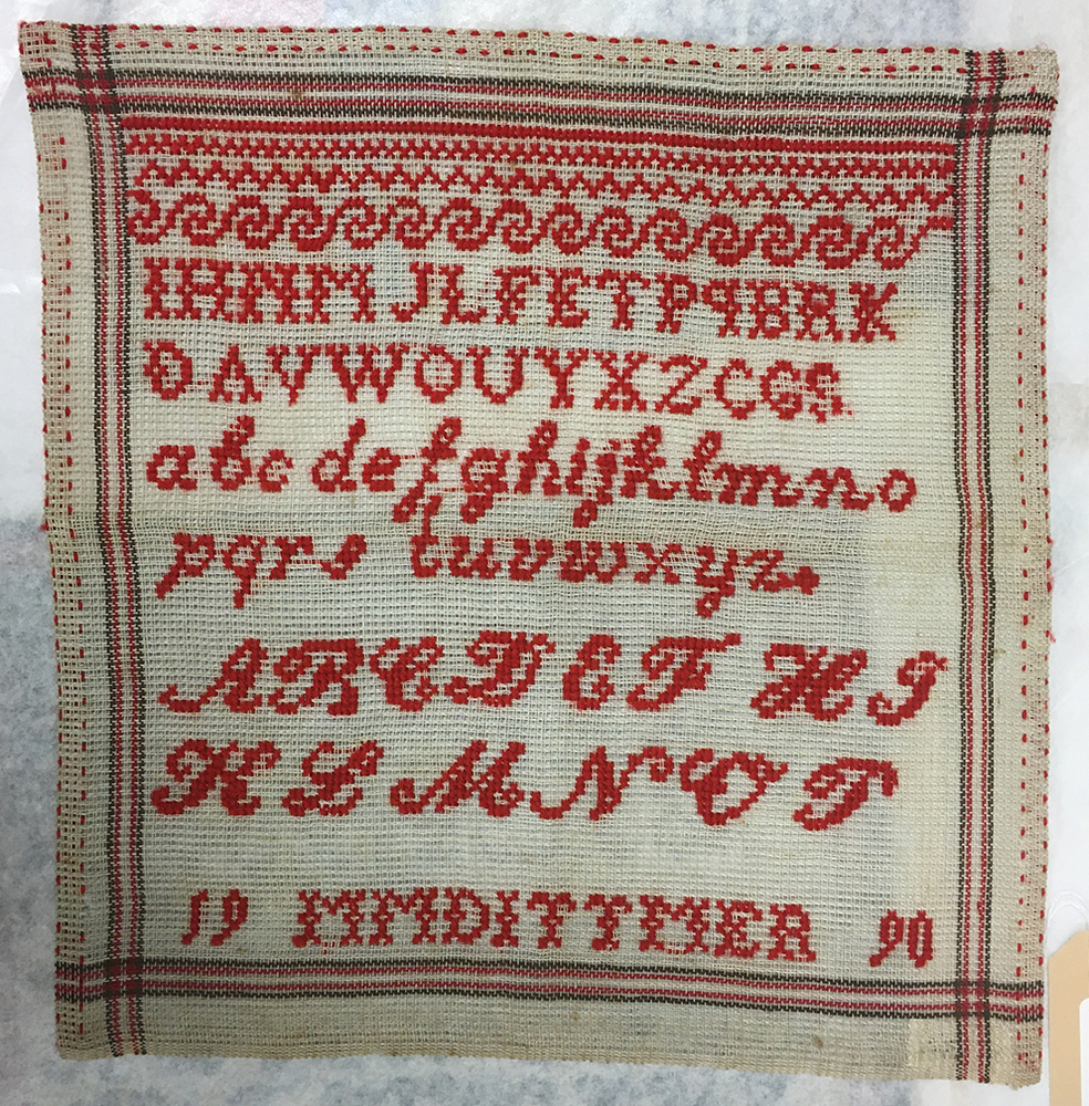 : Het eerste alfabet op deze doek is opgebouwd naar moeilijkheidsgraad. Eerst leerden de meisjes de stokletters borduren de I H N M J L T F E P B R K en D, als ze dat onder de knie hadden kwam de volgende uitdaging, de zogenaamde schuine letters A V W X Y en Z en ten slotte de ronde U C G O Q en S. Practice makes progress. Daarna volgde vaak het ABC in gebruikelijke volgorde.