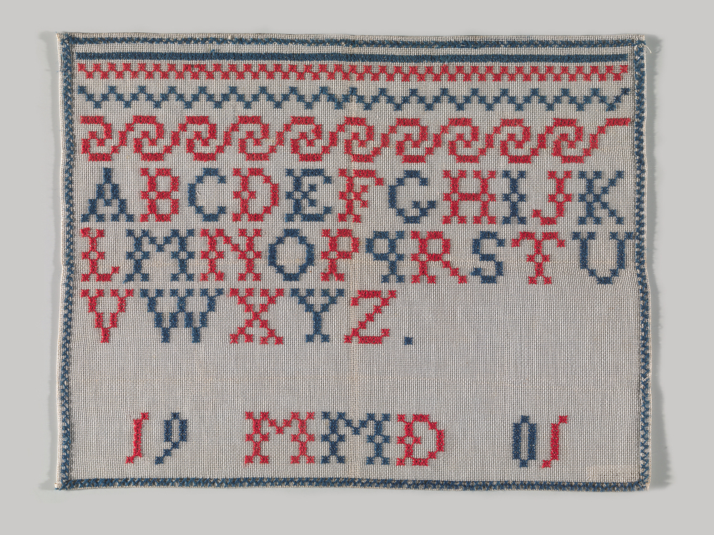 Tussen het werk van Metta bevindt zich een keurig letterlapje dat met sierrandjes en één enkel alfabet, in kapitalen, gevuld is. Daaronder, tegen de onderrand, laat ze haar initialen -MMD- en het jaar waarin de doek voltooid -1901- achter. Metta heeft zichzelf niet gemakkelijk gemaakt. De hele doek is uitgevoerd in stersteek wat in wezen een dubbele kruissteek is en twee zoveel tijd van de borduurster vraagt. Maar dat niet alleen; elk randje, elke letter en elk cijfer is om en om in rood en blauw geborduurd. Dat betekent als je netjes werkt – en dat is Metta wel toevertrouwd – een voortdurend aan- en afhechten van de draad. Metta heeft beslist engelengeduld gehad.