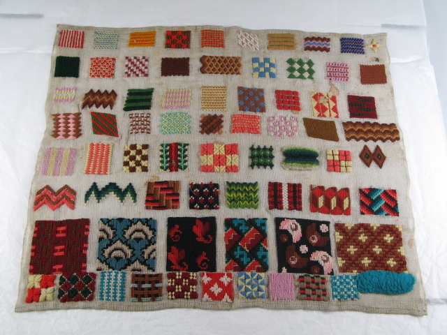 Mevrouw Van Soest heeft met 21 doeken uit één en dezelfde familie aanzienlijk aan de collectie merk- en stoplappen bijgedragen. De schenking omvat het werk van drie generaties: overgrootmoeder Alida Reekers, grootmoeder Wilhelmina Westerveld en de kleindochters Anna, Metta Margaretha en Emma Dittmer en hun nichtje Dorothea Dittmer. Werk van de oudste kleindochter, Wilhelmina, ontbreekt evenals borduurwerk van de moeder van de meisjes. Mevrouw Van Soest is een dochter van Metta Margaretha en Evert van Soest. De meeste van de doeken bevatten de naam of de initialen van de borduursters. Dit exemplaar niet. Gezien de samenstelling van de schenking en de leeftijd van de doek kan het bijna niet anders of deze stekenlap is geborduurd door een van de zusjes Dittmer. De doek meet 46 bij 53,5 cm en is gevuld met 72 wollen proefjes in tapisseriesteken op een grof katoenen stramien. Door afzonderlijke motiefjes te herhalen en op elkaar aan te laten sluiten ontstond één, doorlopend, motief. Vooral in de tweede helft van de achttiende eeuw werd deze techniek met zijden op linnen toegepast. Er werden schoenen, tasjes, boekomslagen en andere luxevoorwerpen accessoires mee bekleed. Dit handwerk werd door oudere meisjes uitgevoerd, voornamelijk door Franse kostschoolmeisjes, maar ook door andere meisjes die de opdracht daartoe kregen. De patronen met wollen garen dienden evenals die met zijde om het hele vlak te vullen. Er waren twee mogelijkheden, de patronen herhaalden zich of één patroon stond uit tegen een achtergrond. Met dergelijk borduurwerk werden onder andere schoenen, tasjes, stoelen, voetenbankjes, schellekoorden en reistassen gedecoreerd. Bij één enkel motief werd de hele achtergrond met één kleur ingevuld. Dat was ongetwijfeld een saai werkje.