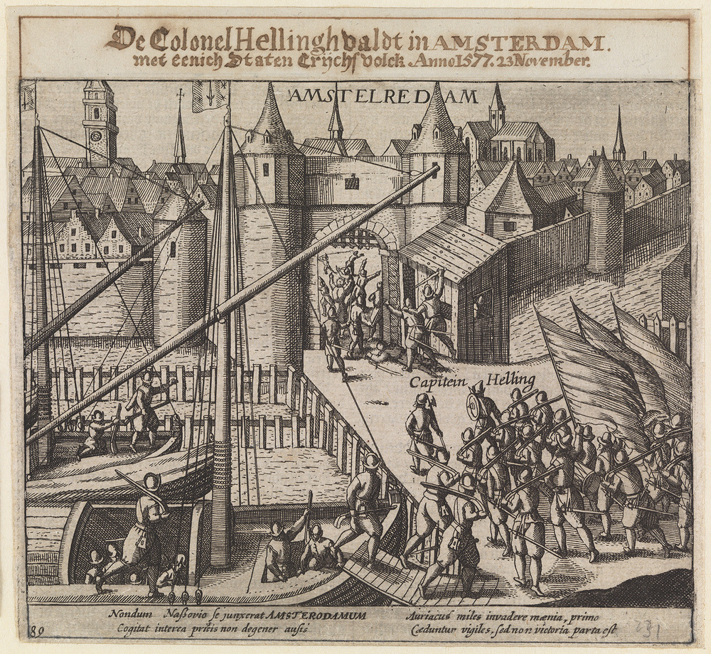 - opschrift boven: De colonel Hellingh valdt in Amsterdam / met eenich staten crijschsvolck. Anno 1577. 23 november
