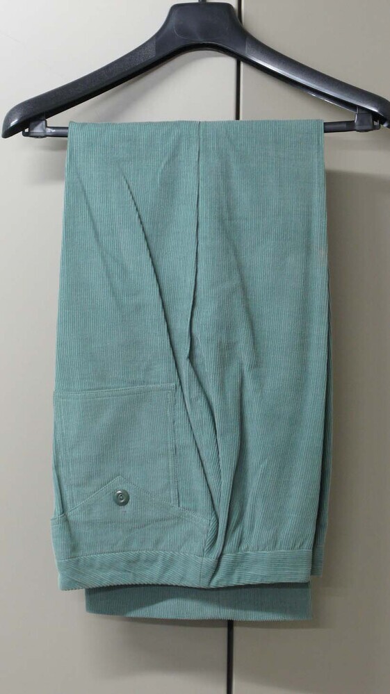 Zeegroen corduroy. Opgestikte zakken met klep op achterpand.- Trefwoorden