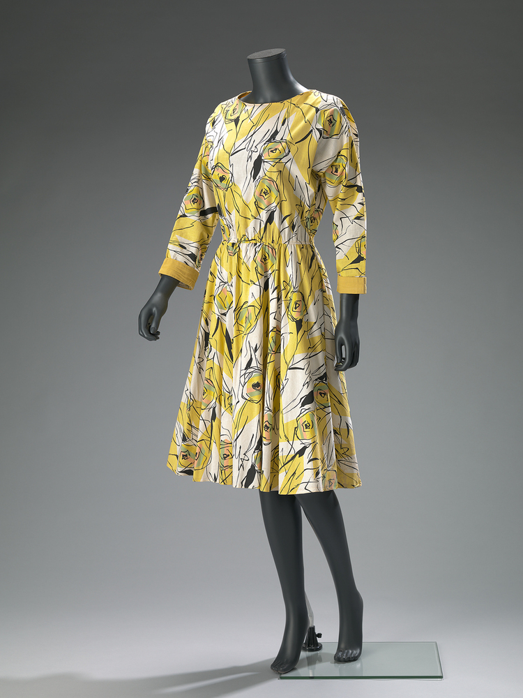 Zomerjapon van wit katoen bedrukt met een gestyleerd bloemmotief (Picasso-dessin) in geel, zwart, groen en zalmroze. Ovale ronde hals met aan de binnenzijde een beleg van gele katoen, verstevigd met plakvlieseline. Aangeknipte mouwen, smal toelopend bij de pols. Omgeslagen manchet, afgezet met dubbelgenomen geel katoen. Halve cirkelrok, glad aan het lijfje gezet. Door het elastiek in de taille is de rok gerimpeld. Een steekzak in beide zijnaden. De zoom is afgelockt, omgeslagen en doorgestikt.