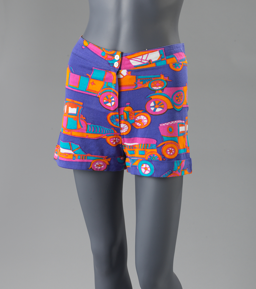 Katoenen tricot, zeefdruk in felle kleuren paars, oranje, rose en blauw, oude auto's voorstellende. Brede, in vorm geknipte, opgestikte tailleband . De hotpant sluit middenvoor d.m.v. een ritsluiting en twee knoop en knoopsgaten.