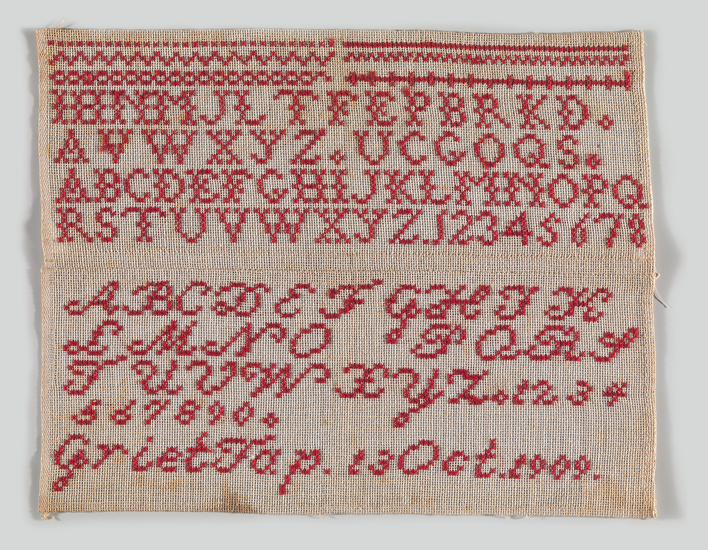 Naast haar rodeschoollapje, maakt Grietje in jaar later, in 1909, nog een klein letterlapje dat opent met het IHN-alfabet waarna ze vervolgens nog twee ABC-alfabetten uitwerkt. Het eerste in Romeinse kapitalen, het tweede in kapitalen en cursief. De ABC-alfabetten worden gevolgd door een cijferreeks. In het laatste alfabet zorgt ze ervoor dat de onderstok van de hoofdletter G niet in het gedrang komt. Grietje ‘signeert’ met een stoerdere versie van haar naam: “Griet Tap. 13 Oct. 1909.”. Het alfabet lijkt op het eerste gezicht willekeurig samengesteld. Niets is minder waar. Het is opgebouwd naar moeilijkheidsgraad. Eerst leren de meisjes de stokletters borduren de I H N M J L F E P B R K en D. Als ze dat onder de knie hebben komt de volgende uitdaging, de zogenaamde schuine letters A V W X Y en Z en ten slotte de ronde U C G O Q en S. In de collectie is een alfabetlint van Grietje opgenomen (KA 19718). Mogelijk een steuntje in de rug? Had Grietje moeite met het leren van het alfabet? Griet kiest voor dit letterlapje voor rood katoenen garen op een katoenen stramien. Ze vult de doek met uitsluitend kruissteekjes.